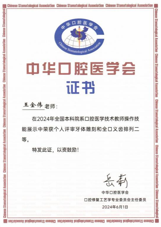 为满足人才培养的需求,研讨会期间进行了全国卫生职业院校口腔医学技术操作技能展示。展示活动分为学生组操作技能展示和教师组操作技能展示,展示项目共设三大模块,展示活动共有来自全国81所口腔相关院校共计197名操作技能展示选手(学生133名,教师64名)同台交流切磋。我校口腔医学技术专业教师王金伟、学生周琦萱在“牙体雕刻和全口义齿排列”项目中,经过激烈角逐,由中华口腔医学会口腔修复工艺专委会主任委员四川大学华西口腔医学院岳莉教授、上海交通大学口腔医学院傅远飞教授等组成评委评审,分别荣获本科院系教师组二等奖和学生二等奖的好成绩。