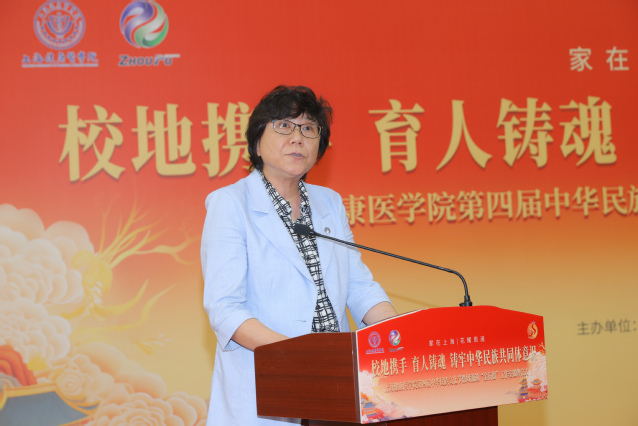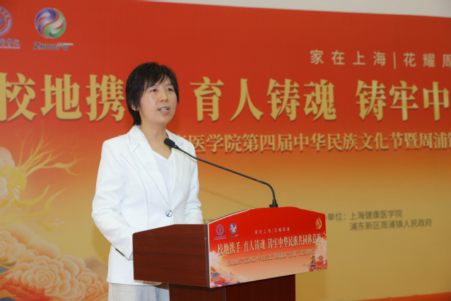 于莹致开幕词。她首先向一直以来关心支持学校民族工作的市、区、镇各级领导的关心指导表示由衷感谢。她指出,学校始终把民族团结进步活动纳入教学育人全过程,形成了全市卫生民族班层次“全”、对口援建“实”的工作特色亮点,近年来与区委统战部签订了民族团结进步共建协议,与“全国民族团结进步模范集体”周浦镇建立了紧密的民族团结进步共建合作关系。校地共建合办中华民族文化节,不仅能为各民族学生锻炼成长搭建平台,也是民族团结进步教育进校园、进社区,民族团结进步联建共建的生动实践。她强调广大师生要深入学习贯彻党的二十大精神,全面贯彻习近平总书记关于加强和改进民族工作的重要思想,进一步铸牢中华民族共同体意识,为上海这座光荣的城市谱写民族大家庭、奋进新时代的新篇章。