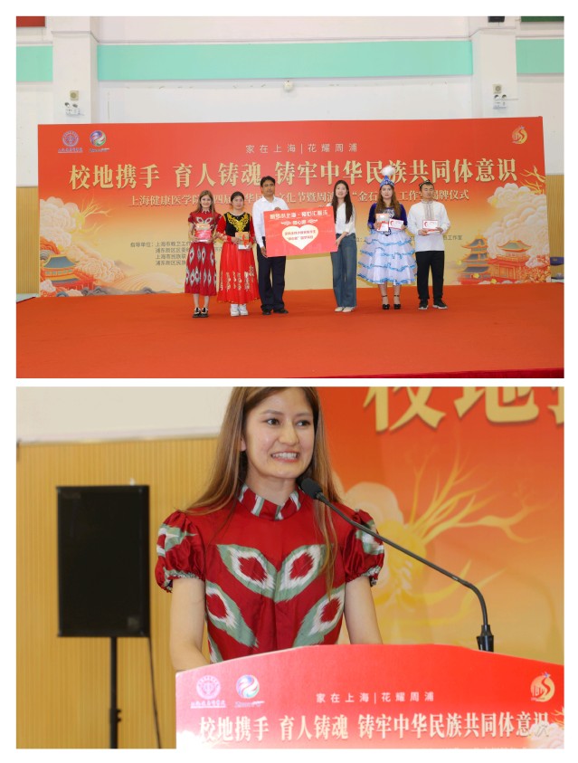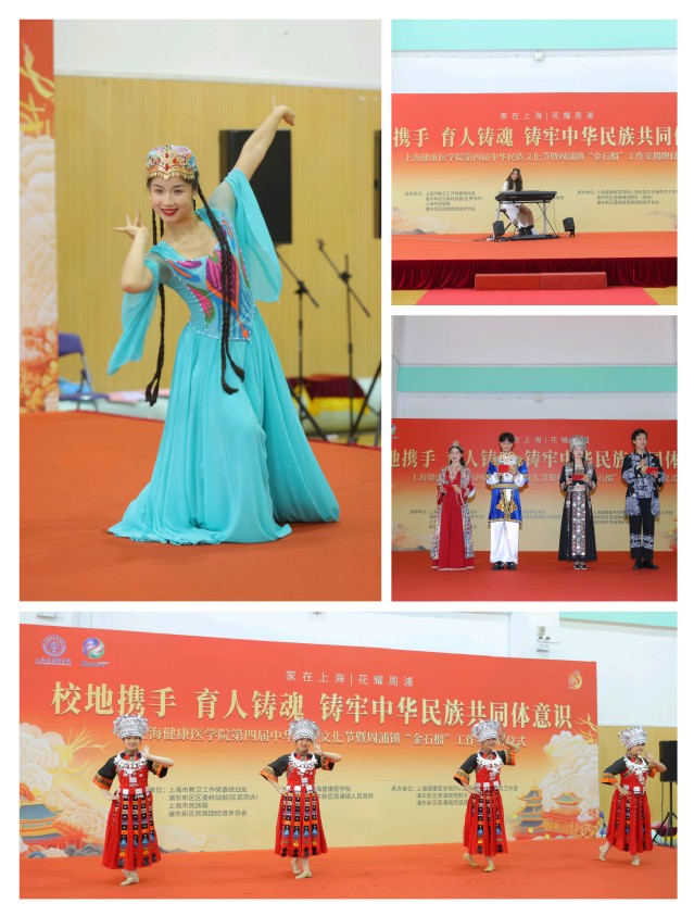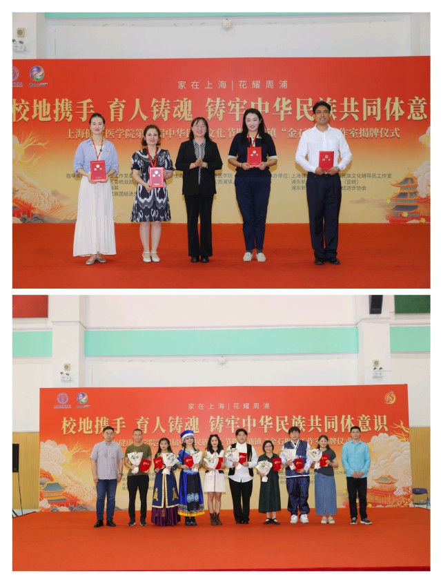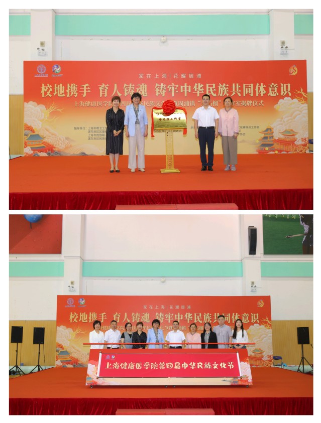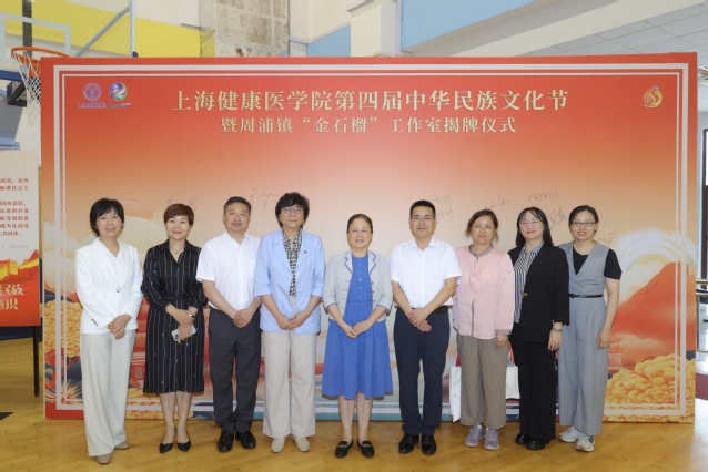为深入贯彻落实习近平总书记关于加强和改进民族工作的重要指示精神,推动开展常态化长效化铸牢中华民族共同体意识宣传教育,6月20日下午,上海健康医学院第四届中华民族文化节暨周浦镇“金石榴”工作室揭牌仪式隆重举行。上海健康医学院党委书记郭永瑾、浦东新区区委统战部副部长、区民宗办副主任达明宗、上海健康医学院党委副书记于莹、上海市民宗局民族二处处长蒋悦新、浦东新区区委统战部民宗处副处长罗美玲、上海市民族联副秘书长黑颖、浦东新区民族团结进步协会副会长向延卫、周浦镇党委副书记闵敏、上海健康医学院党委常委、组织部部长、统战部部长张可菡、学生处副处长于杨等领导及周浦镇党群办(宣统)、周浦镇民族团结进步协会代表、上海健康医学院民族宗教工作领导小组全体成员及师生代表出席活动。