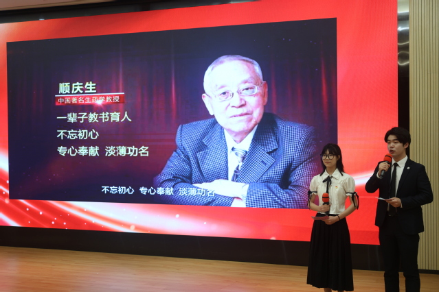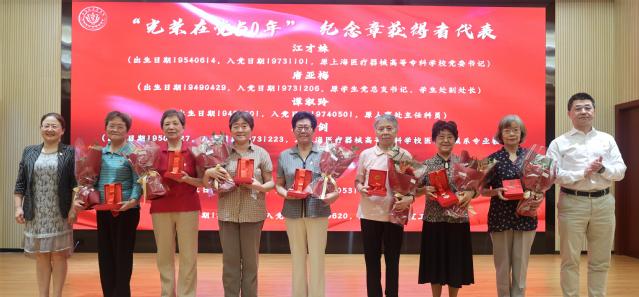 党委书记郭永瑾,党委副书记、校长吴韬为“光荣在党50年”老党员颁发纪念章并献花,表达崇高的敬意。