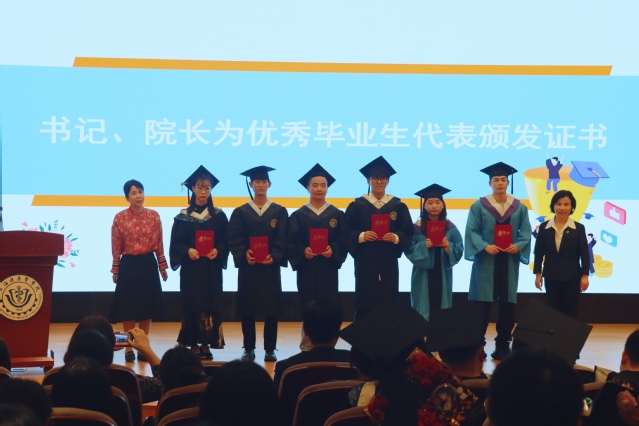 朱清宣读学院上海市优秀毕业生、校优秀毕业生,以及校长荣誉学位获得者名单。朱清、徐小萍为优秀毕业生代表颁发荣誉证书。同学们以热烈的掌声为坚持梦想、勇于拼搏,脚踏实地、努力前行的伙伴们喝彩!
