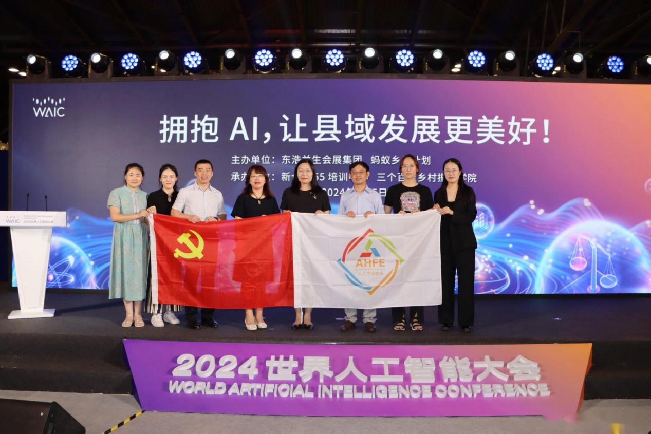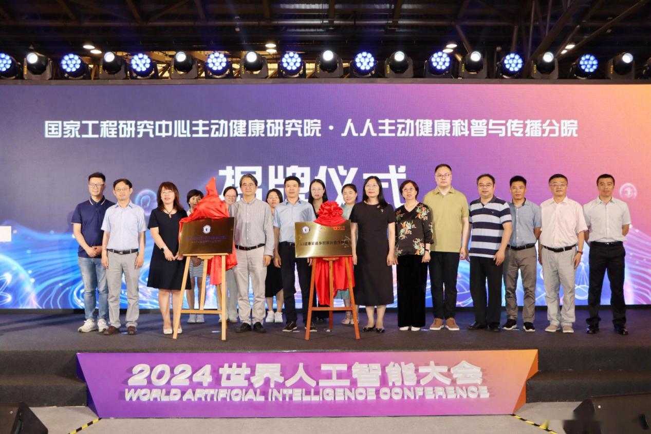 2024年7月5日下午,在2024世界人工智能大会(WAIC)期间,国家工程研究中心主动健康研究院·人人主动健康科普与传播分院在上海世博展览馆的WAIC大会发布台上正式揭牌成立。揭牌仪式由蚂蚁乡创计划发起人于杰主持,上海交通大学教授、国家工程研究中心主动健康研究院院长兼国研中心长三角健康产业研究中心主任鲍勇致辞;同济大学附属东方医院范慧敏教授和上海健康医学院王婷婷教授共同为“国家工程研究中心主动健康研究院·人人主动健康科普与传播分院”揭牌;上海大学医学院副院长姚萱和浙江驻沪办长三角联络处处长蔡桂友为“AI健康赋能乡村振兴合作联盟”揭牌。来自上海健康医学院、上海医学会健康管理分会、上海中西医结合学会和上海第六人民医院等十几位人人主动健康管理(AHFE)团队的核心成员和学生代表共同见证了这一重要时刻。