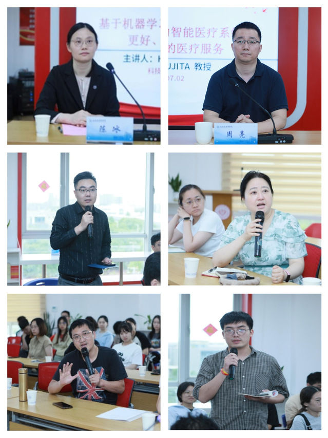 我校上海市智能医疗器械与主动健康协同创新中心副主任周亮主持交流互动环节。与会人员积极参与交流学习,气氛热烈。赵文龙老师、李鹏老师、黄青清老师和研究生张森同学等围绕人工智能、大语言模型等在老年健康智能照护及科研领域的应用等进行交流提问,Fujita教授耐心地聆听并逐一给予指导和建议。