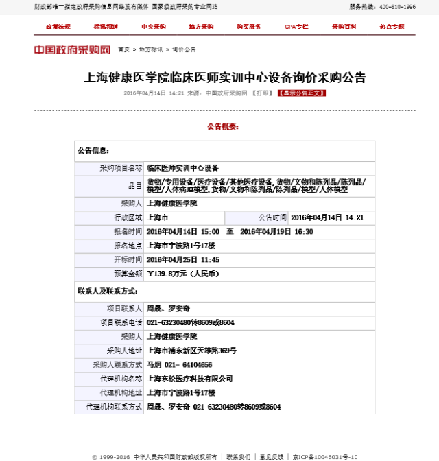 上海健康医学院临床医师实训中心设备询价采购公告