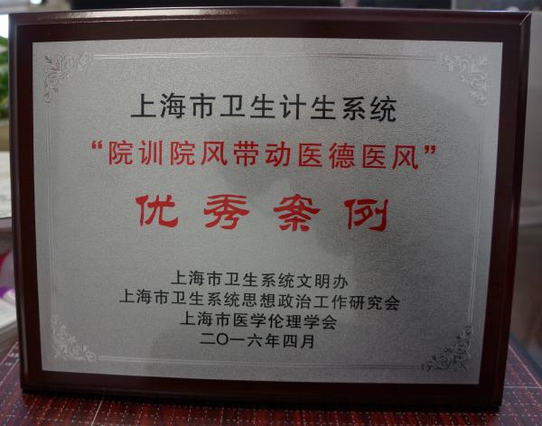 在4月19日召开的上海市卫生计生系统医疗管理与精神文明、政风行风建设大会上,周浦医院的“以‘善’为根,树院风育医德”项目被授予上海市卫生计生系统“院训院风带动医德医风”优秀案例。