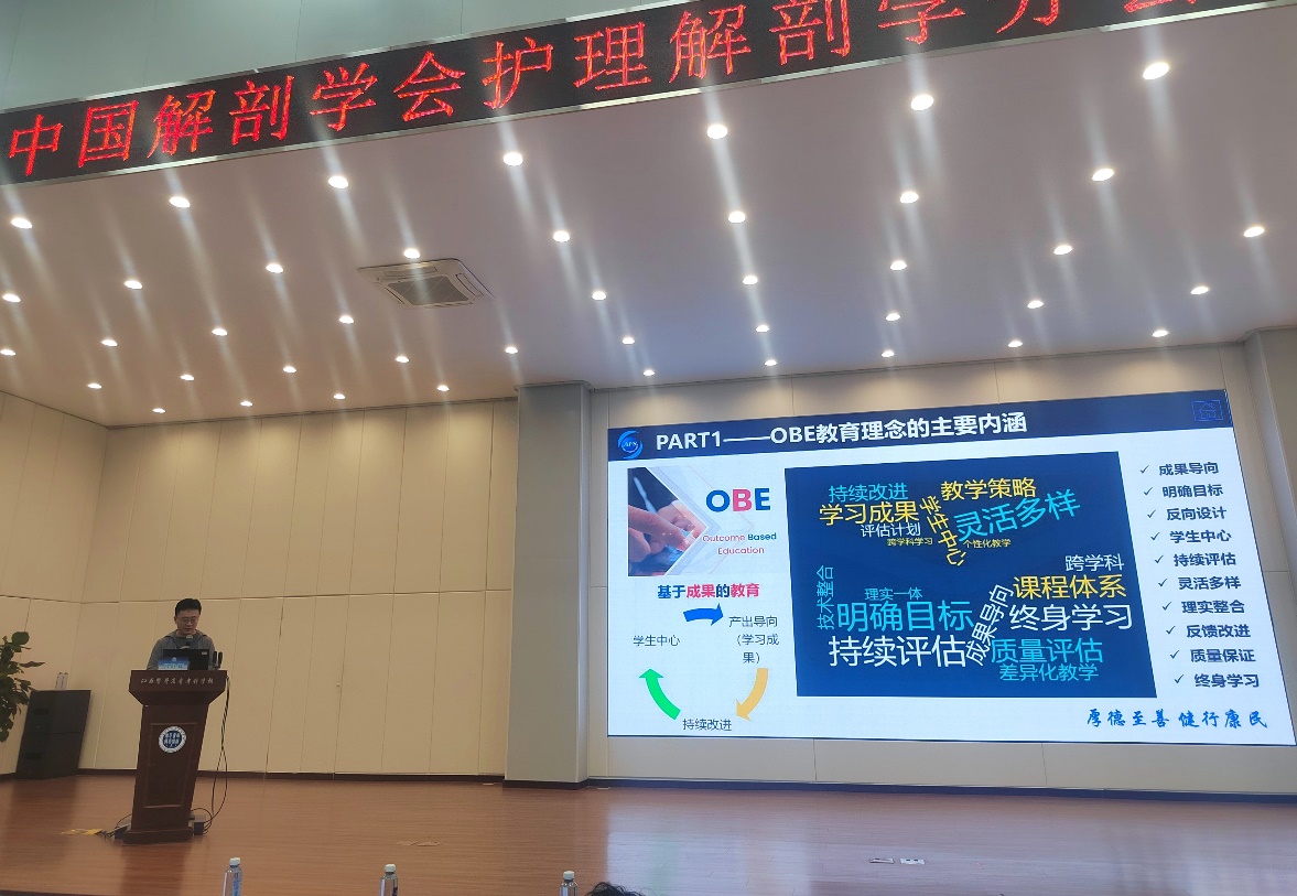 中国解剖学会党委书记、副理事长刘学政,组织委员、副理事长崔慧先、江西解剖学会理事长祝高春、中国解剖学会护理解剖学主任委员丁自海等专家教授出席本次大会。河北医科大学崔慧先教授、中山大学徐杰、王华侨教授等多位专家从学科发展、医学科普、课程信息化建设等多个方面作了精彩的专题报告。我校吕叶辉老师受邀作了主题为《各阶段护生基于OBE理念下学习效果与综合体验的Meta分析》的论文报告。