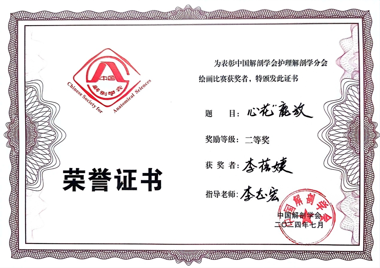 人体解剖学与组织胚胎学绘画比赛随后进行,我校临床医学院李蓓婕、药学院宣闻烨、陈轩逸同学绘制的作品在500多幅作品中脱颖而出,获得二等奖一项,三等奖两项的佳绩。“宝剑锋从磨砺出”,我校自2017年始即举办解剖学绘图比赛,积极探索“医艺结合”的育人路径,努力发挥绘图大赛在医学基础教育和医学生综合素质培养中的作用,取得很好效果。
