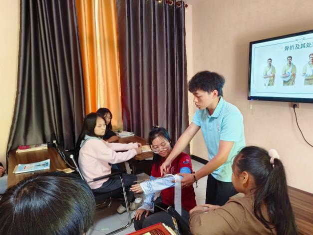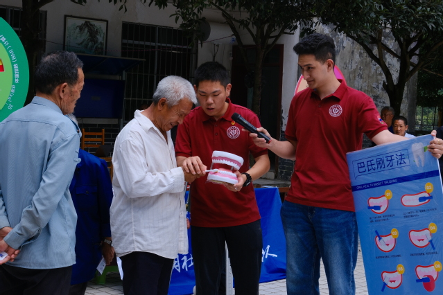 随后团队成员跟随花秋镇卫生院的医生们共同前往于花秋镇养老院展开义诊和关于老年急救、口腔护理和膳食营养的科普宣传。团队成员根据老年人常见的心脏病发作、中风和跌倒等问题进行了理论知识的讲解,并向院内老人演示了几种实用的包扎方式,针对不同部位受伤情况,“手把手”教学。团队成员用简洁朴素的语言,向院内老人介绍膳食营养知识,讲解老年人常见的口腔问题,并演示巴氏刷牙法。
