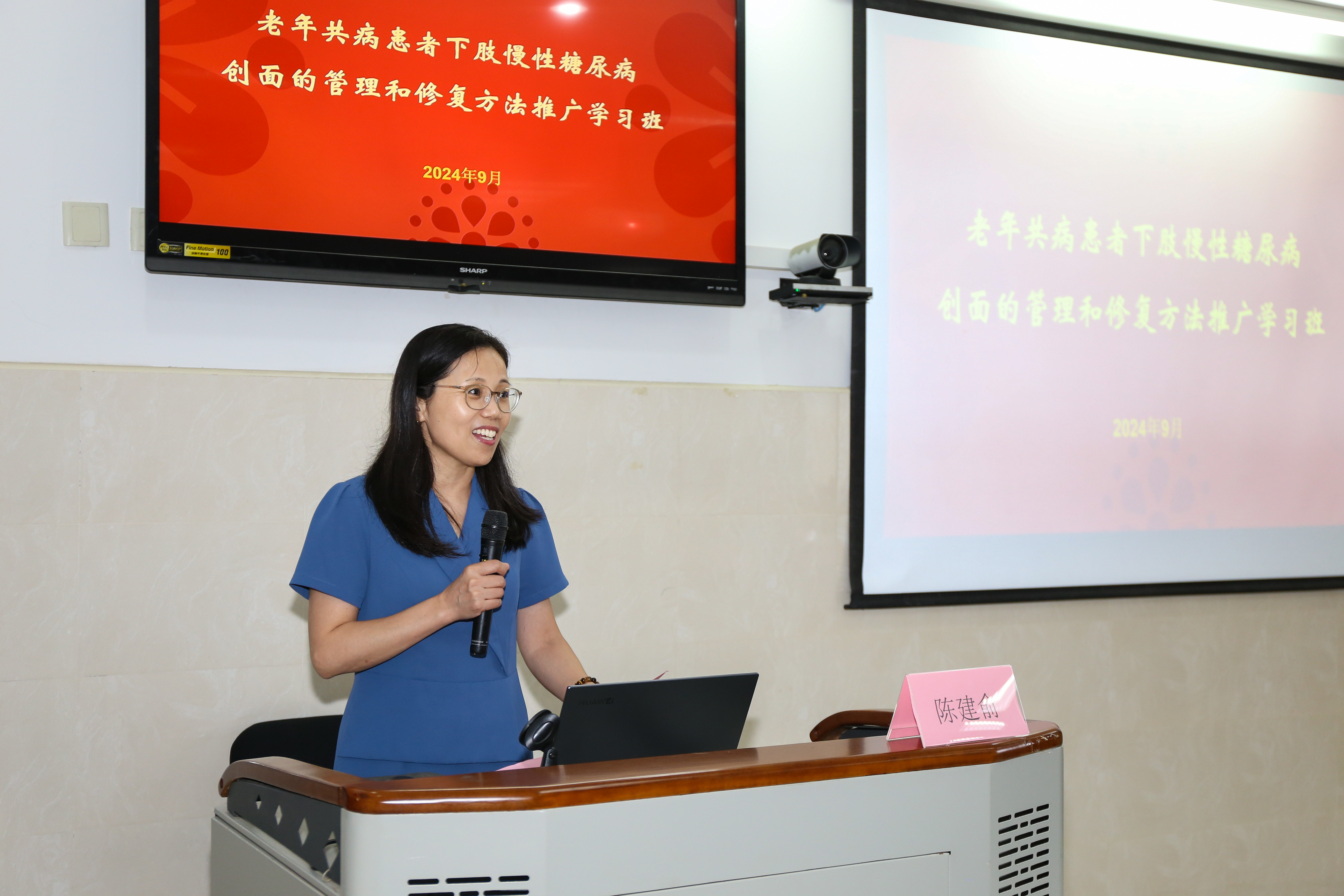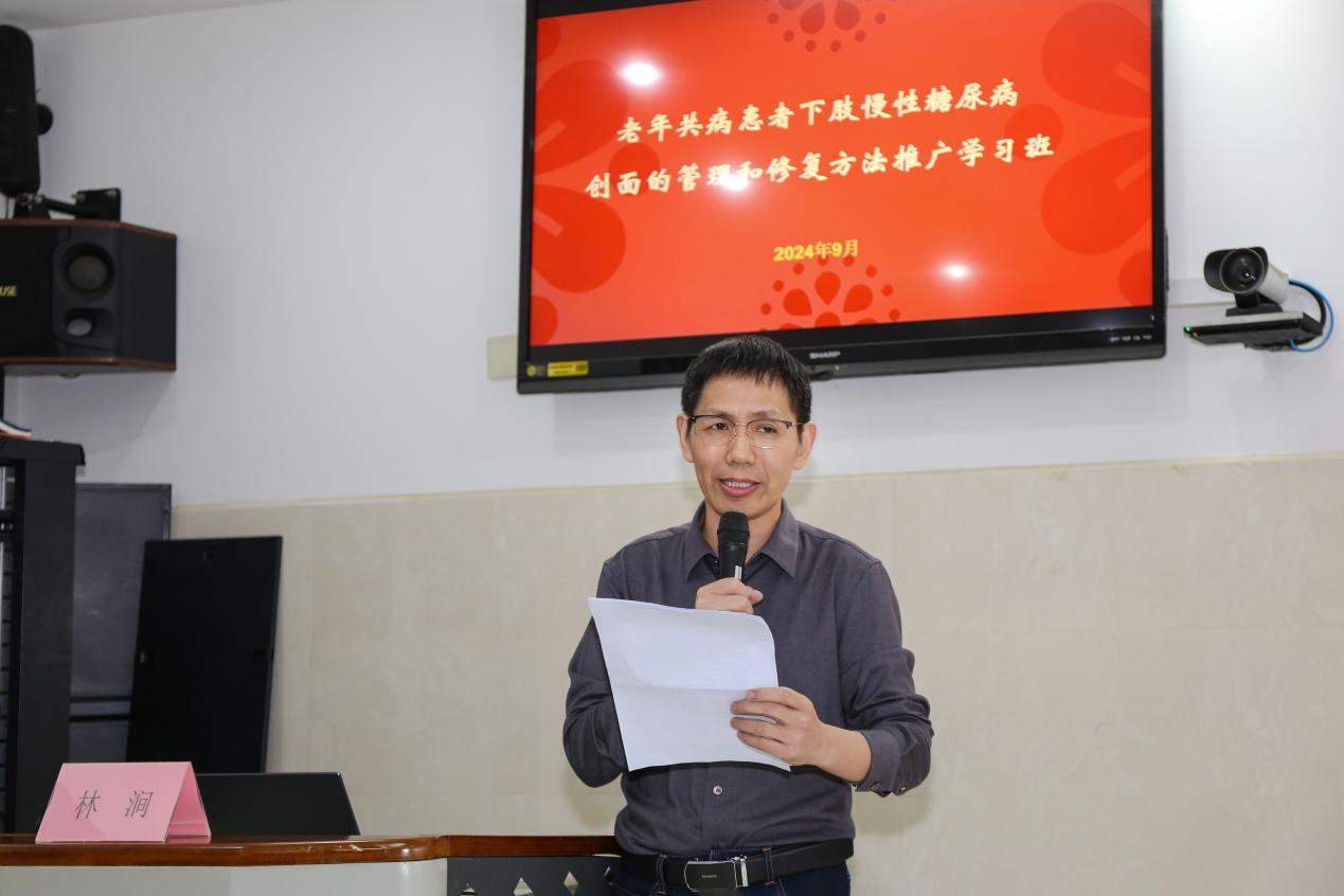 研讨会上,附属崇明医院党委书记朱美文和上海健康医学院科技处副处长陈建俞分别致辞。创面防治研究所所长林涧主任致欢迎词,并作了《老年共病患者下肢糖尿病创面的修复方法与疗效分析》的报告,介绍了自己多年来的临床经验,并对创面防治研究所学科建设的发展提出了期望和要求,寄语参会的师生“复杂的事情简单做,你就是专家;简单的事情重复做,你就是行家;重复的事情用心做,你就是赢家。”希望大家用对科研的热忱和专研的毅力,为创面防治这个“大医院的小病,小医院的大病”贡献力量,为解除患者病痛努力。
