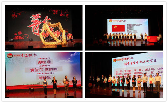 大会共分为青春痕迹、青春梦想、青春绽放三个篇章。表彰大会在喜庆的舞龙表演中拉开序幕,同学们专业精彩的表演博得了观众的热烈掌声。大会以两位主持人深情的朗诵开场,两位主持人带领我们回顾了五四运动的历史、共青团的光荣传统、团旗团歌的知识,在场的同学们在朗诵声中,重温了历史,增进了对于团史的了解。大会进入第二篇章青春梦想,两位主持人介绍习近平总书记为青年提出的八字真言,诠释了“勤学,修德,明辨,笃实”的内涵真谛,号召青年学生坚定理想信念,下得苦功夫、求得真学问,善于明辨是非、善于决断选择,笃实扎实,踏踏实实做人。随后播放的团学宣传片展示了学校建校以来团学工作的思路目标和成绩效果。