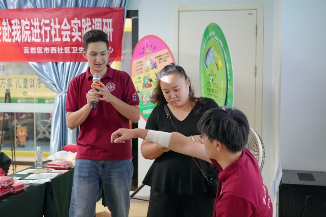 座谈会之后,实践团队于7月23日与24日分别前往了贵阳市云岩区市西社区卫生服务中心与贵阳市南明区国际生态城社区卫生服务中心进行交流学习,实践团队为进一步提升附近居民们的生活质量,向他们介绍了营养标签、每日所需营养成分这些专业的膳食营养知识,并利用牙齿模型演示巴氏刷牙法,以通俗易懂的语言讲解老年人常见的口腔问题,提升居民们口腔和眼睛的保健意识。最后,针对可能遇到的问题,团队成员向居民们演示了几种实用的急救包扎方式,和正确心肺复苏方法。马志波代表学校,分别与两家单位签约挂牌实践育人基地。未来学校将在人才培养、见习实习等方面发挥优势,依托社区医院的有利条件,使同学走出去回得来,服务家乡,加强慢病管理,将上海的安宁病房与当地的长者照护中心,中医食疗相融合,提升老人的生活质量,安享晚年。