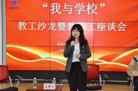 乘着全国教育大会召开的东风,在第40个教师节和新中国成立75周年之际,10月9日上午,教师工作部、校工会在北苑1号楼500教工之家举办了一场温馨而富有意义的“我与学校”教工沙龙暨教职工座谈会。校党委书记郭永瑾,校党委副书记、工会主席于莹,组织部、人事处、教师工作部、工会、相关学院负责人和16名新进教师代表、先进教师代表齐聚一堂,共话发展。本场座谈会由第六届上海高校青教赛二等奖获得者、医学技术学院教师董晛主持。