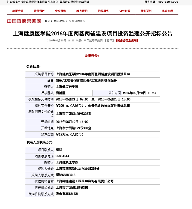 上海健康医学院2016年度两基两辅建设项目投资监理公开招标公告