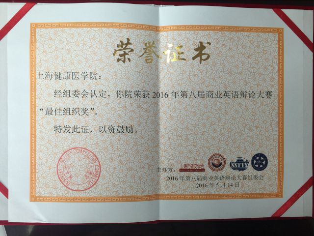由上海市外文学会、上海市科技翻译学会、国际英语教育研究协会、中国科学院上海分院主办、韦博英语及英弘教育等协办的2016年第八届商业英语辩论大赛历经一个多月的文案初选、三场复赛后,我校辩论队从百余支来自各地的参赛队伍中脱颖而出,最终获得本届比赛的现场辩论环节二等奖2名、三等奖1名和初赛环节文案策划奖若干的佳绩。赛后,组委会为我校颁发了“最佳组织奖”的称号。