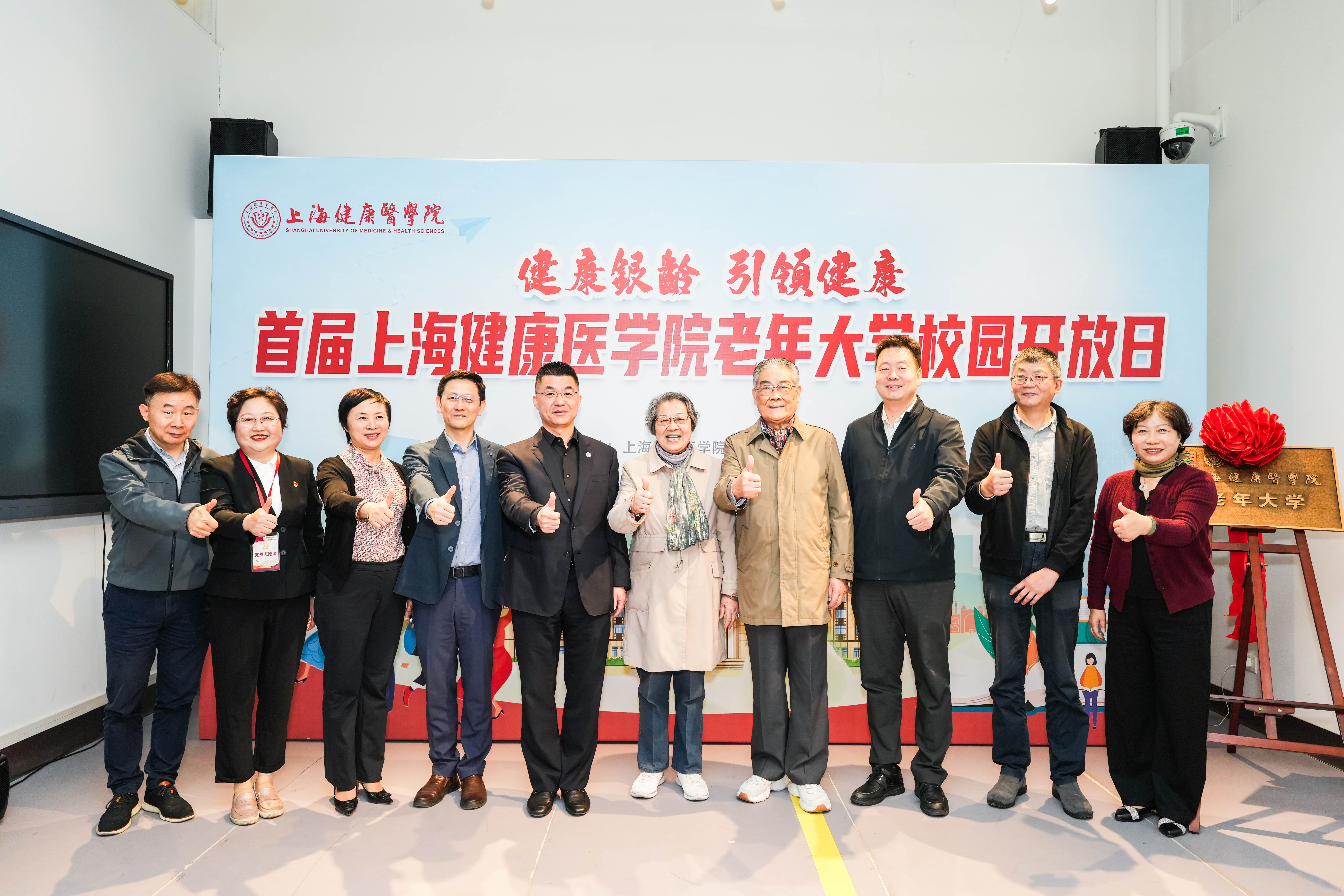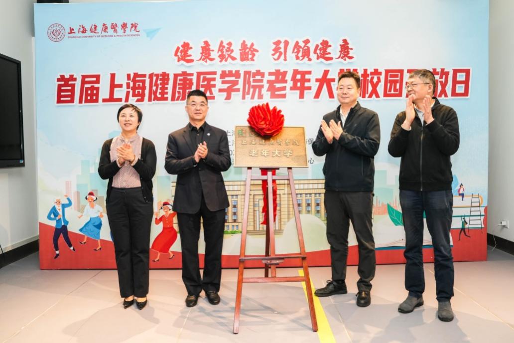 10月24日,“健康银龄,引领健康”首届上海健康医学院老年大学校园开放日暨揭牌仪式在上海健康医学院实践教学中心隆重举行。上海健康医学院校长吴韬、副校长汤磊,上海市教育委员会终身教育处处长闫鹏涛,市老年教育工作小组办公室副主任沈韬,浦东新区周浦镇副镇长盛丽萍等出席揭牌并致辞,兄弟院校老年大学负责人,三级医院工会、退管会代表,离退休教职工代表,学校相关职能部门负责人,老年大学管理团队,老年大学党员志愿者团队及社区老年朋友们,共150余人参加。