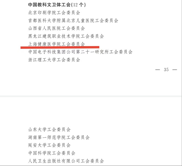 中国教育工会上海健康医学院委员会在上海市教育工会和学校党委领导下,始终坚持以习近平新时代中国特色社会主义思想为指导,学习宣传贯彻党的二十大精神、习近平总书记关于工人阶级、工会工作重要论述和中国工会十八大精神,以新时代工会思想引领的扎实作为积极建家,并作为上海市教育工会中职联工会委员会会长单位,发挥引领辐射作用,指导职教系统六十多家会员单位的建家工作。学校工会立足新发展阶段,全面贯彻新发展理念,守正创新,积极作为,团结带领全校教职工奋进新征程,荣获上海市教育系统“示范性妇女之家”、上海市教育系统“模范职工之家”、“上海市厂务公开先进单位”、全国教科文卫体系统“模范职工之家” 称号。