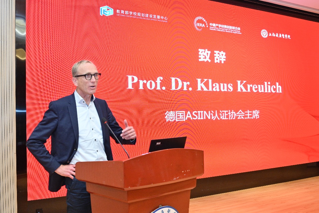 德国ASIIN认证协会主席 Prof.Dr.Klaus Kreulich为大会致辞,他表示德国ASIIN认证协会与上海高等教育的合作源远流长,国际化的交流合作为双方带来了先进教育理念的交互学习和实践互动。此次来校交流,希望能在未来加深与我校的合作,促进学术交流、课程开发和科学研究,为学生提供更多的国际实习和交换机会,从而形成更加多元的国际化学习环境,培养提升应用技术型人才的国际化视野,借鉴吸收欧洲相关产业的校企合作新模式,进一步助力学校提升国际化办学进程以及人才培养国际认可度。