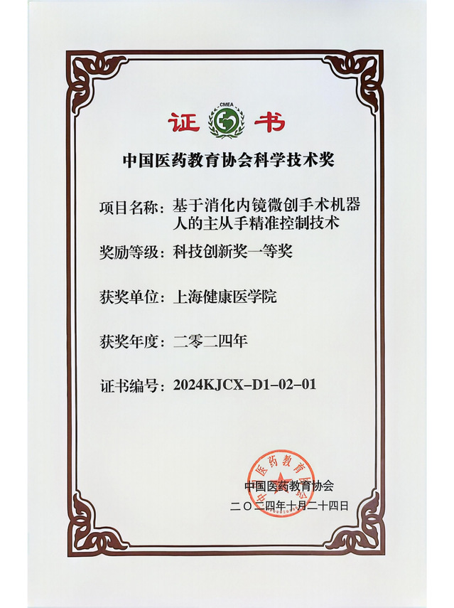 我校医疗器械学院孙丽萍教授领衔申报的科研成果《基于消化内镜微创手术机器人的主从手精准控制技术》荣获中国医药教育协会2024年科学技术奖科技创新一等奖。