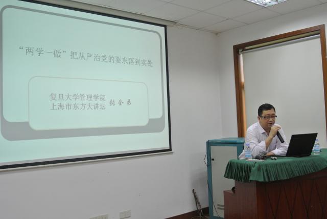 本次联组学习,支部专程邀请了中组部全国干部培训高校基地、复旦大学管理学院培训中心副主任、原杨浦区行政学院院长张全弟教授作《两学一做把从严治党的要求落实在基层》专题辅导报告。张教授从“四个全面”战略布局出发,为我们系统梳理了全面从严治党的清晰脉络,从重构政治生态、突出地方党委的政治责任,推进全面从严治党向基层延伸的理念,阐述了如何将两学一做把从严治党的要求落实在基层的举措等。张教授的报告深入浅出,既有理论高度,又贴近实际,立足当前,分析透彻,让支部党员同志们在坚定理想信念、强化党性观念、增强实干精神上受益良多。作为学校的行政职能部门要通过“两学一做”把为师生提供优质服务,落实到日常工作的全过程、各方面。校党委副书记、纪委书记李明磊作为一名支部普通党员全程参加了学习。