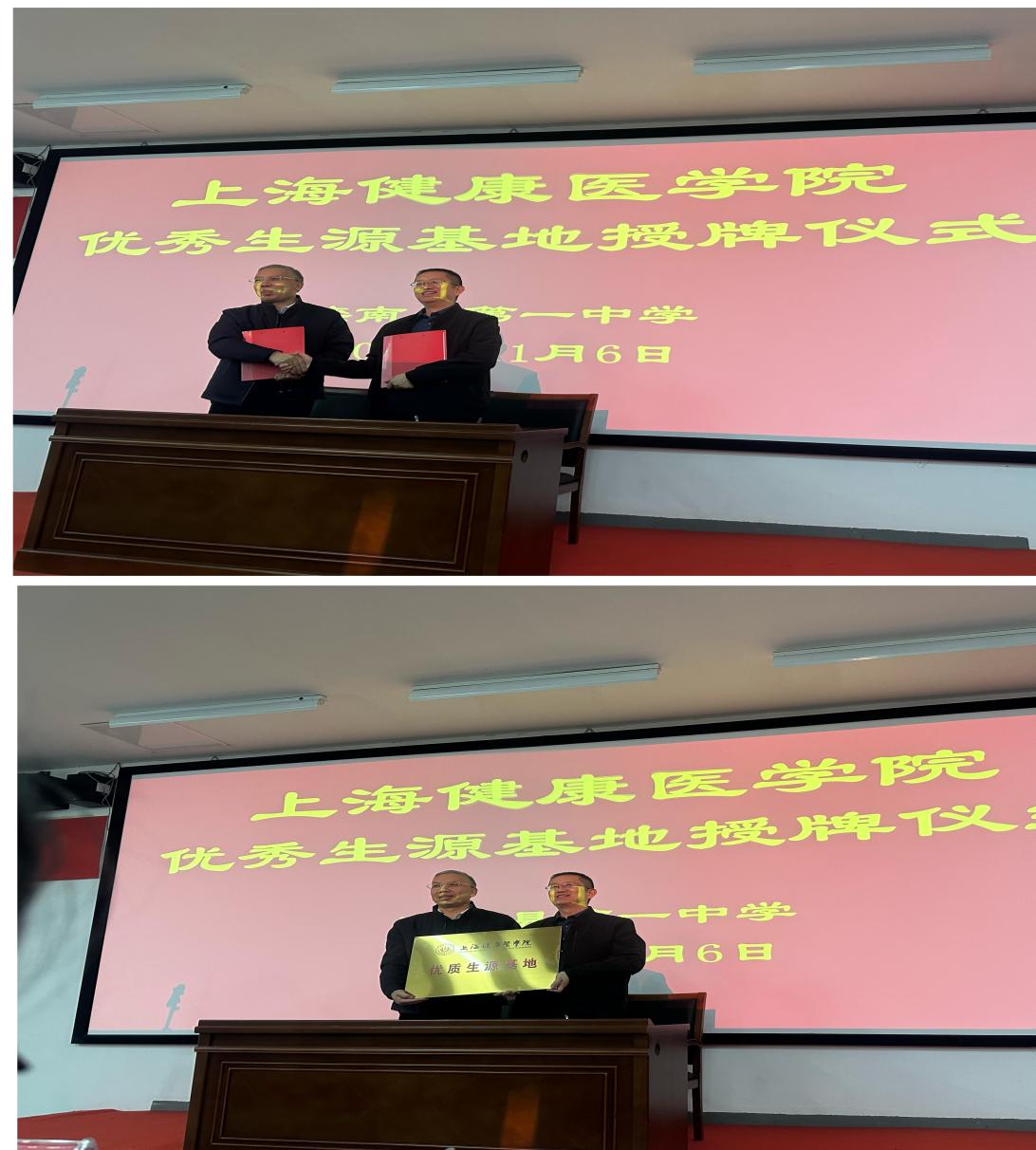 在师生的共同见证下,朱爱勇代表上海健康医学院与河北滦南一中签署了合作协议,并授予滦南一中“上海健康医学院优质生源基地”荣誉牌匾。