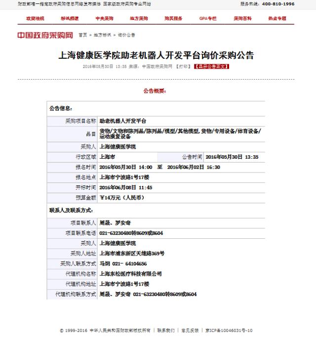 上海健康医学院助老机器人开发平台询价采购公告