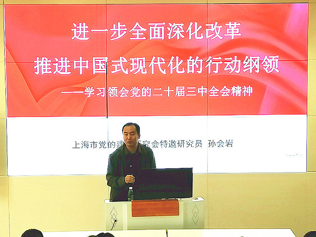 孙会岩围绕习近平总书记在党的二十届三中全会上的重要讲话和《中共中央关于进一步全面深化改革、推进中国式现代化的决定》精神以及“为什么”“改什么”“怎么办”三个问题,从进一步全面深化改革的重大意义和总体要求、聚焦重点在更高水平上进一步全面深化改革、提高党对进一步全面深化改革的领导水平等三个方面对全会精神作了系统宣讲和深入阐述。