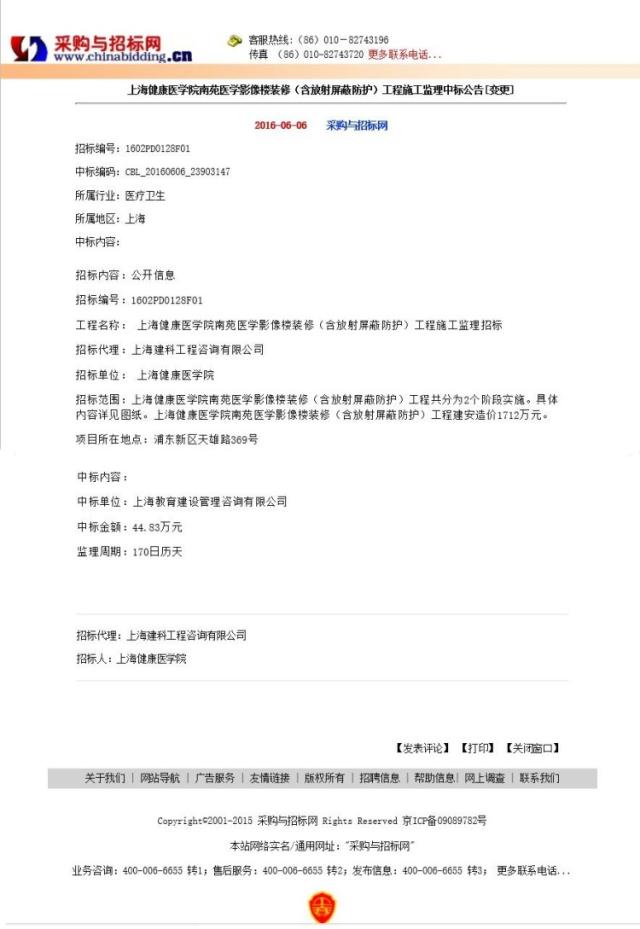 医学影像楼装修(含放射屏蔽防护)工程施工监理中标公告(变更)
