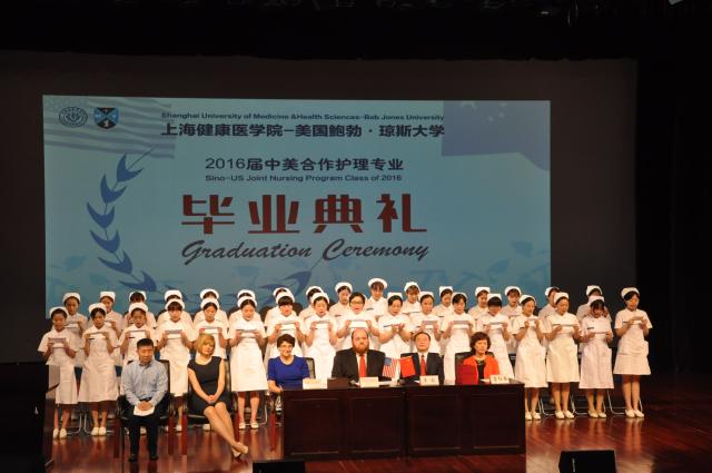毕业典礼伴随着庄严的入场音乐,身着护士服的毕业生代表们缓缓走进会场。接着,黄钢发表讲话,他表达了对毕业生们的美好祝愿,希望他们在未来的道路上再接再厉,迎接辉煌。Mary Lamb博士送上了饱含真情的勉励和祝福。毕业学生代表王旺同学向母校表达了深情的感谢与依恋。随后,中外领导为2016届毕业生颁发了毕业证书并合影留念。全体外籍教师上台合唱,祝福毕业生在未来的人生道路中永远保持健康的体魄和良好的心态,努力实现人生梦想。