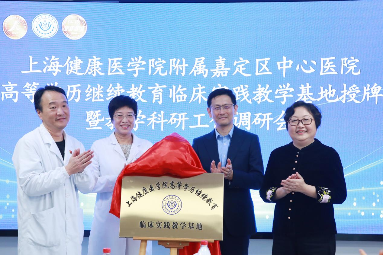 调研会前,在学校、医院领导的共同见证下,高等学历继续教育临床实践教学基地授牌仪式举行。附属嘉定区中心医院在全日制教育、毕业后教育、继续教育以及终身教育领域中发挥了重要的作用。此次正式挂牌,对于满足成教医学生在临床实践方面的需求具有重要意义,有助于进一步提高在职医学生的专业技能和实践水平。