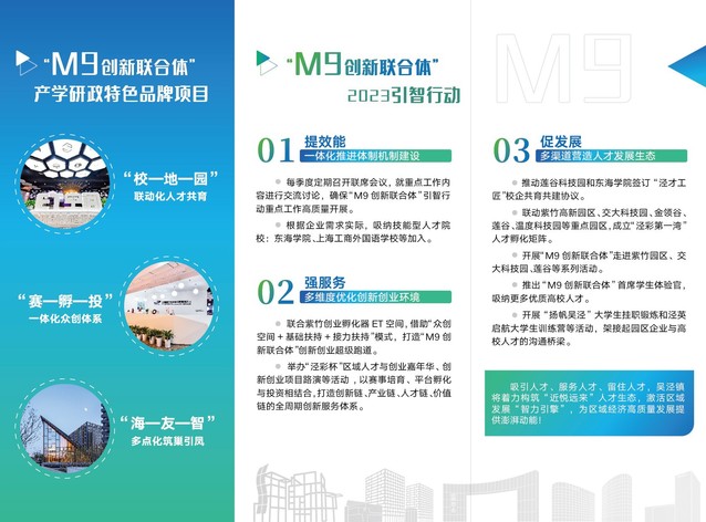 “M9”创新联合体是吴泾镇党委联合申通集团党委,将周边高校与紫竹等国家级科创园区以及莲谷科技园、交大科技园等重点园区串联起来,共同打造的产学研政特色品牌项目。目前已有上海交通大学、华东师范大学等10所高校加入。随着我校加入“M9”创新联合体,成为其中唯一的一所医学类本科高校,通过产学研政联动联创,推动校地资源共享和互补。