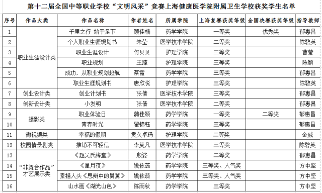 附:上海健康医学院附属卫生学校获奖学生名单