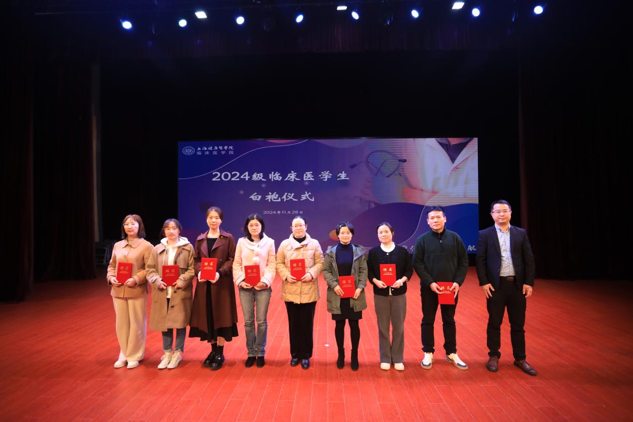 1128日下午,“健康使命·医梦起航”——2024级临床医学生白袍仪式在北苑1号楼400人报告厅隆重举行。校党委副书记、副校长唐红梅,学工部部长童清以及附属周浦医院、嘉定区中心医院、第六人民医院临港院区、奉贤区中心医院和基础医学院、文理教学部、外语教学部相关部门老师,临床医学院全体教师、2024级临床医学本科共计201名学生参加仪式。