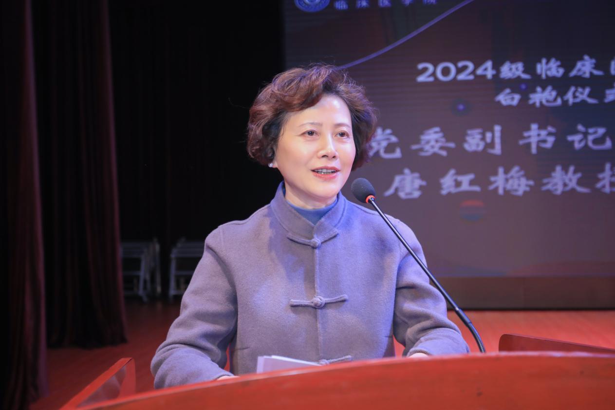 白袍仪式旨在增进同学们的医学人文精神,激发同学们将高尚医德与精湛医术作为终生的职业追求,刻苦学习,志存高远,永葆初心,牢记使命,担负起建设“健康中国”、“健康上海”的重大责任,在服务健康中国事业中书写人生的华美篇章。唐红梅结合自身学医经历为青年医学生寄语她提出三点希望:希望同学们精研医术医学知识丰富且更新快,要在课堂、实验室、临床实践等各环节深入学习、严谨操作、追根究底,锤炼诊断与治疗能力,以扎实学识和精湛医技守护生命。希望同学们秉持仁心患者寻医时满怀痛苦与不安,要给予他们关切眼神、暖心问候、耐心倾听等,诊疗时兼顾疗效与负担及患者心理等因素,用悲悯情怀编织医患信任纽带。希望同学们坚守初心医路虽荆棘丛生,面临诸多挑战,但要牢记对生命敬畏、为苍生解困的初心,在不同医疗场景勇担使命,让白袍闪耀光辉,护佑人间安康。医学之路,恰似攀峰,布满坎坷,可一旦身着白袍,便有了无畏风雪的坚毅、矢志不渝的情怀、救死扶伤的本领。愿刚步入医学神圣学府的医学生们不负白袍,医途璀璨