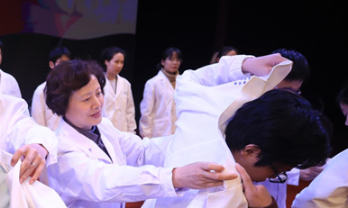 在庄严的国歌中,白袍仪式拉开序幕。在授袍仪式环节,党委副书记、副校长唐红梅临床医学院常务副院长杨光锐基础医学院院长杨智昉附属周浦医院教学办主任杨涛,第六人民医院临港院区教学办主任谢芳艺,附属嘉定区中心医院医师刘晓丽、奉贤区中心医院医师刘晓黎等11位导师亲自将整洁、神圣的白袍授予医学生代表,并为他们穿上白袍、整理衣扣、送上嘱托。台下,全体医学生在庄重和严肃的气氛中,一起郑重地穿上白袍、整理好衣扣。