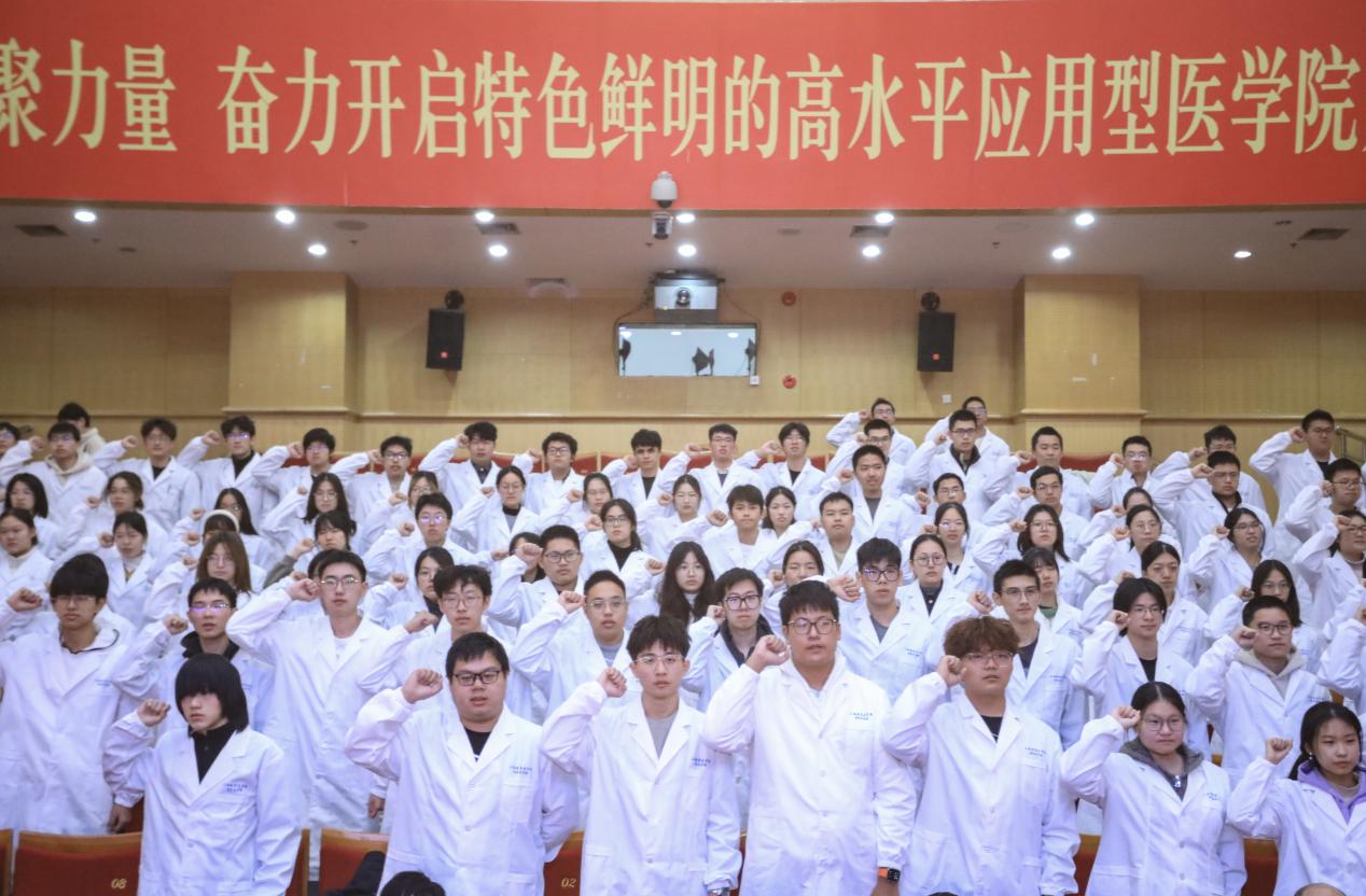 在临床医学院副院长姜文霞的带领下,医学生们右手握拳,以积极昂扬的精神面貌,庄严宣誓医学生誓言。铿锵誓言久久回荡,表达了医学生们献身医学的决心,坚定的理想信念,不忘初心,共同传承“敬佑生命、救死扶伤、甘于奉献、大爱无疆”的医学职业精神。