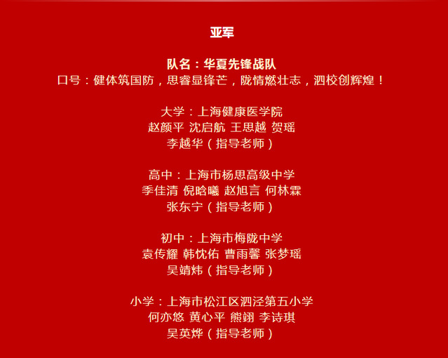 今年大赛共吸引全市16个区涵盖小学、初中、高中、大学四个学段近800所学校组队报名参加初赛,经过三轮线上知识竞答,四个学段的前六名队伍(学校)晋级线下总决赛。24支队伍采用不同学段联合组队的形式,组成6支联队参与总决赛。经过激烈比拼,由我校、上海市杨思高级中学、上海市梅陇中学、上海市松江区泗泾第五小学组成的“华夏先锋战队”获得亚军。