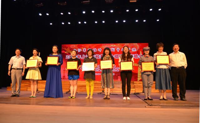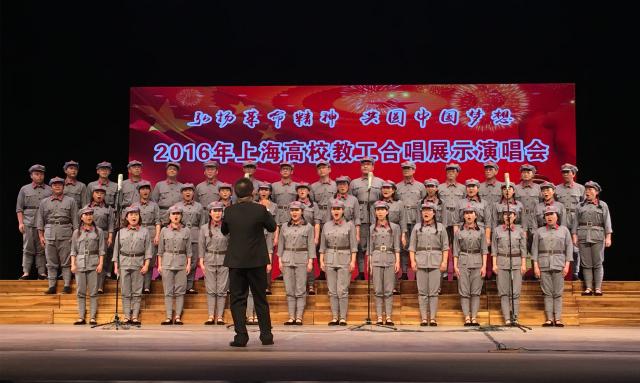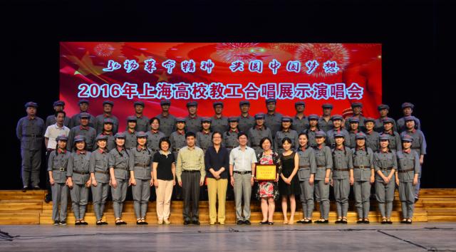 6月15日下午,由上海市教育工会主办的“弘扬革命精神 共圆中国梦想”2016年上海高校教工合唱展示演唱会在上海交通大学菁菁堂隆重上演。全市23家高校的25支合唱团参加了此次展演。我校教工合唱团凭借铿锵有力的《到吴起镇》一曲,脱颖而出,荣获优秀演唱奖中的第一名。校党委副书记李明磊到现场为团员们加油助威。市教育工会常务副主席王向群、副主席吉启华与团员们合影留念。