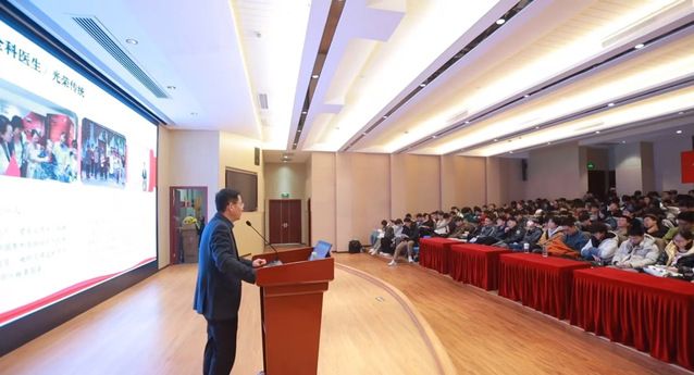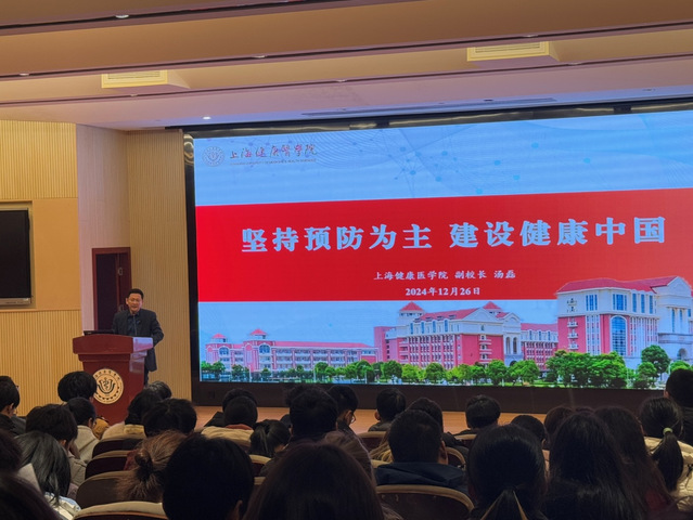 12月26日下午,在北苑200人报告厅,上海健康医学院副校长汤磊以《坚持预防为主 建设健康中国》为题,围绕“坚持预防为主 守护人民健康”“创新医防融合 共筑健康中国”两个篇章,为2024级全体临床医学专业、预防医学专业的学生带来一场理论丰富且鲜活生动的“人民健康”课。
