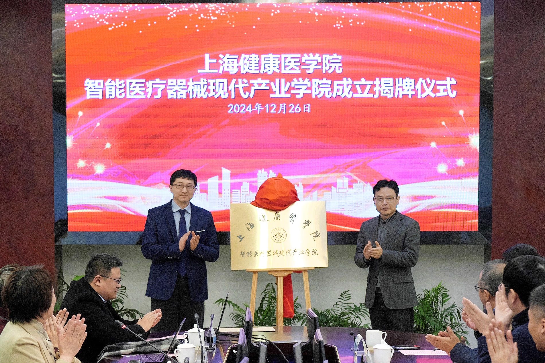 在大家的共同见证下,医疗器械学院院长杨晖和教务处副处长(跟岗锻炼)孟祥国为上海健康医学院智能医疗器械现代产业学院成立揭牌。