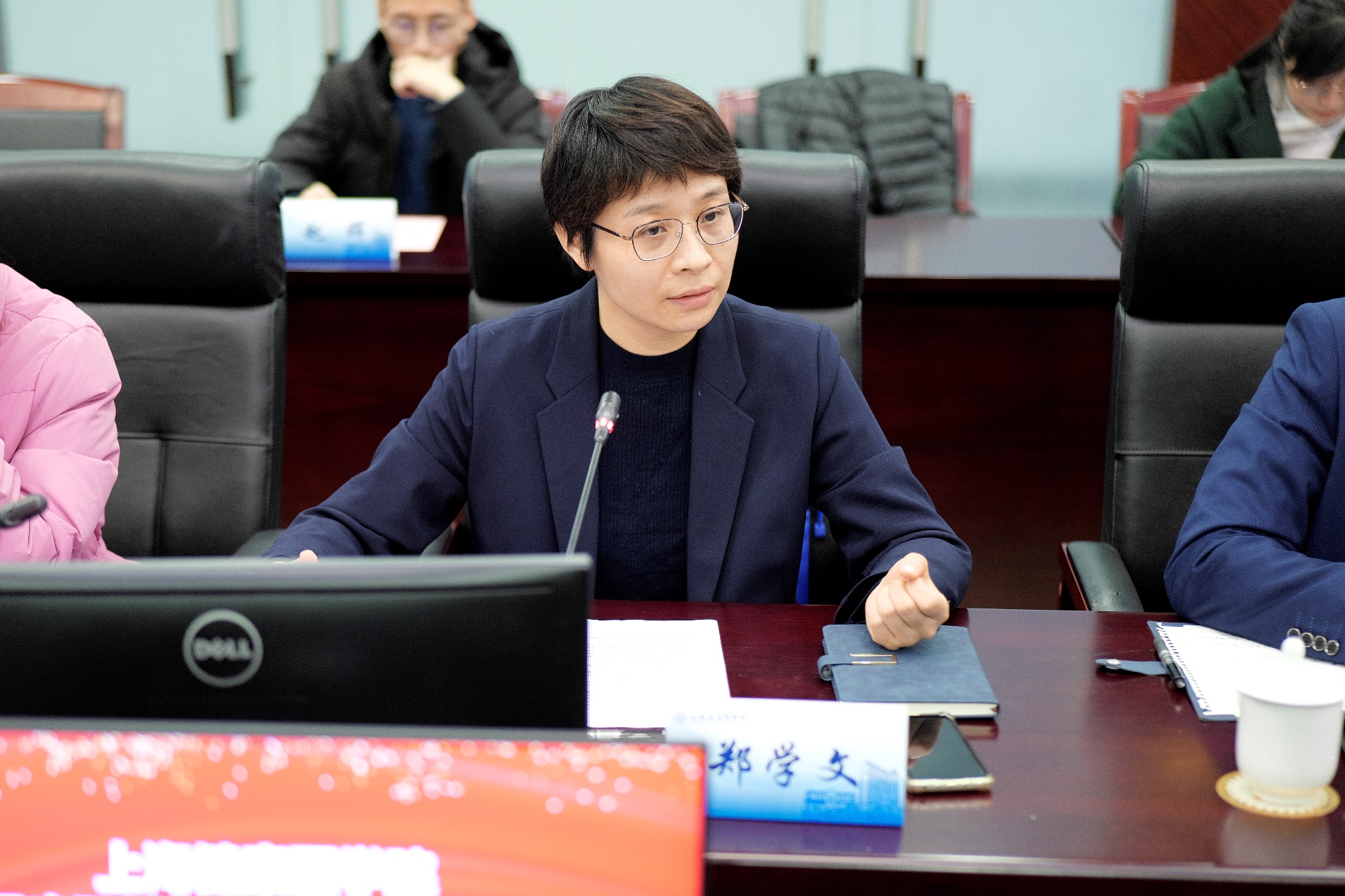 医疗器械学院党总支书记郑学文代表学院致辞。智能医疗器械现代产业学院的成立是响应国家《健康中国战略》的具体行动,也是推动医疗器械产业创新发展的重要举措。她提出四点目标与愿景:深化产教融合、共同培养好人才、促进科研成果转化、服务于区域产业发展。