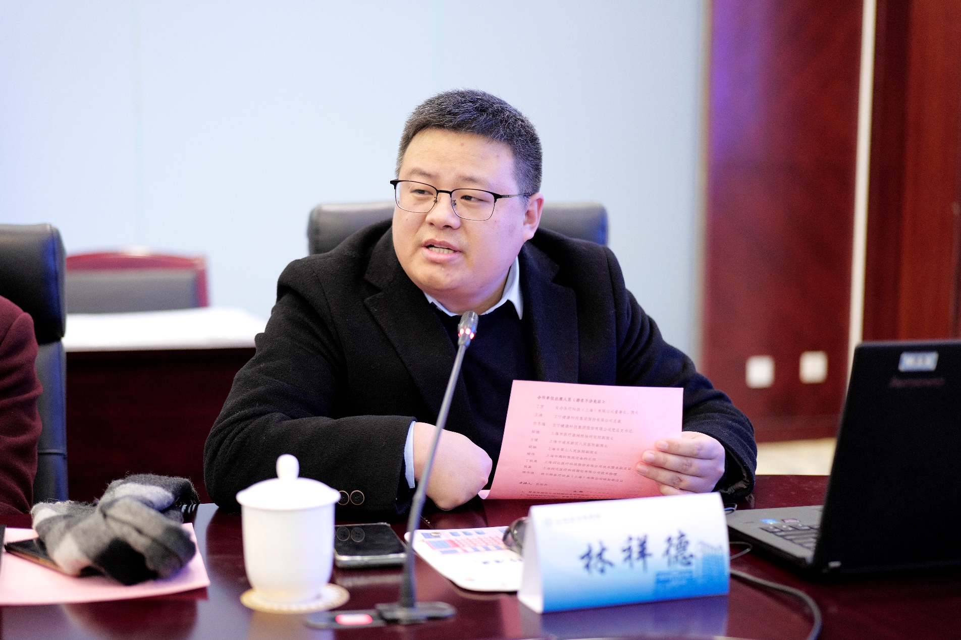 在揭牌、授牌仪式后,智能医疗器械现代产业学院产教融合综合办主任林祥德从背景概况、建设基础、建设计划和建设思考四方面介绍了智能医疗器械现代产业学院的情况。