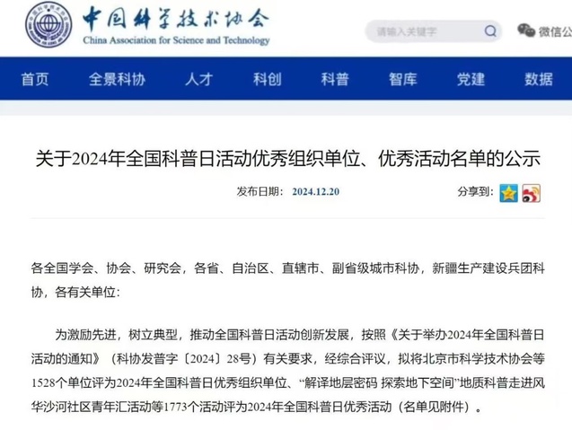 近日,中国科学技术协会公布《关于2024年全国科普日活动优秀组织单位和优秀活动名单的评审结果》,我校荣获2024年全国科普日活动优秀组织单位。