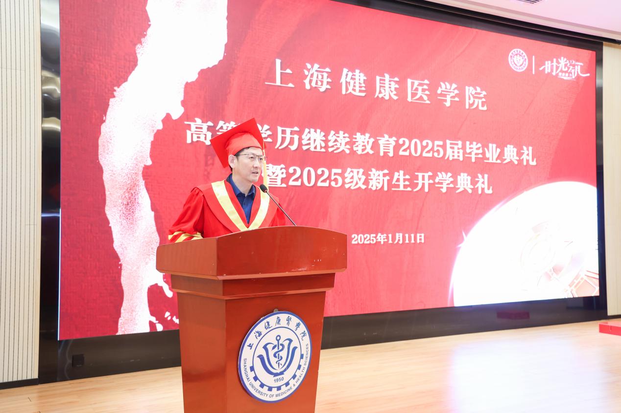 1月11日上午,上海健康医学院高等学历继续教育2025届毕业典礼暨2025级新生开学典礼在北苑200人报告厅隆重举行。上海健康医学院副校长汤磊、护理与健康管理学院院长朱爱勇、药学院院长徐一新、医学技术学院党总支书记姚谷芳、医学影像学院院长李晓欧等学院党政负责人、各教学点负责人、班主任、毕业生代表和新生代表参加典礼。同时,典礼在校官方视频号进行了同步直播。会议由继续教育学院副院长孙海涛主持。