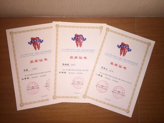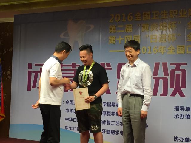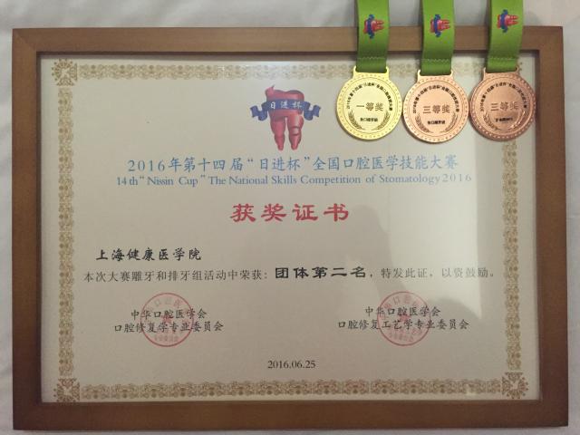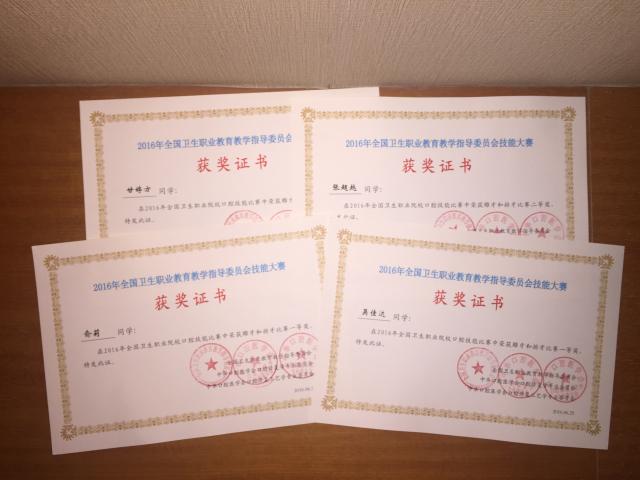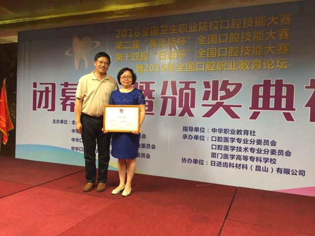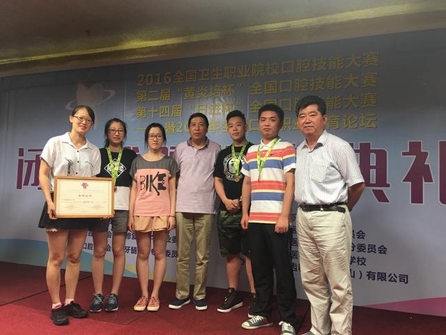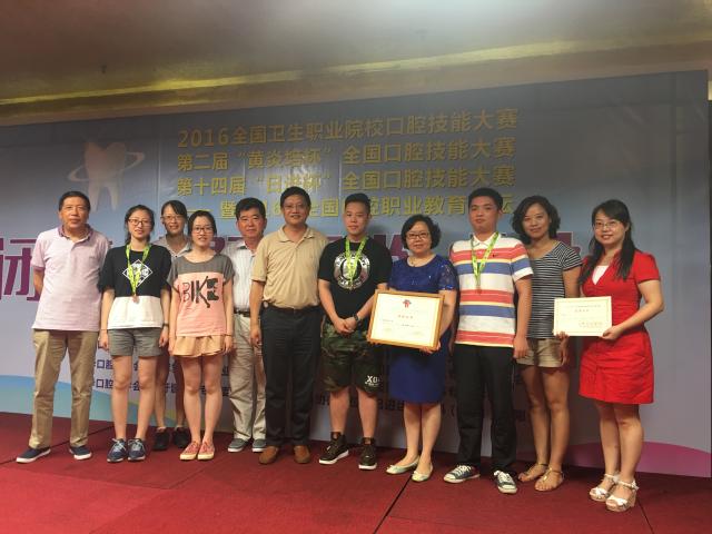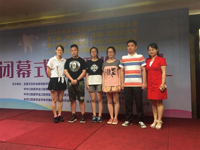 2016全国卫生职业院校口腔技能大赛、第二届“黄炎培杯”全国口腔技能大赛、第十四届“日进杯”全国口腔技能大赛于6月25日在厦门医学高等专科学校隆重举行。经过激烈角逐,我校获得了团体亚军的佳绩,医学技术学院口腔医学技术专业高职14级吴佳达和俞莉同学获得了2016全国卫生职业院校口腔技能大赛全能一等奖,中高职贯通13级张超越和甘婷芳同学获得了全能二等奖。同时吴佳达同学获得了全口排牙组单项一等奖,俞莉同学获得了全口排牙组单项三等奖,张超越同学获得了牙体雕刻组单项三等奖。