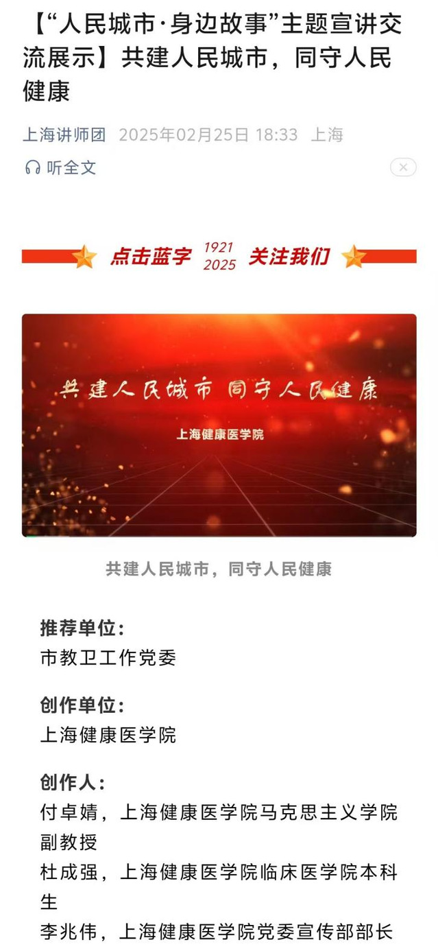 近日,为深入学习宣传贯彻习近平总书记给“老杨树宣讲汇”全体同志重要回信精神,推动各级宣讲团队进一步讲好人民城市理念及其上海实践,上海市组织开展了“人民城市·身边故事”主题宣讲交流展示活动。我校马克思主义学院报送的作品“共建人民城市 同守人民健康”的微视频,在上述活动中展示,获得“上海讲师团”等媒体平台宣传推广。