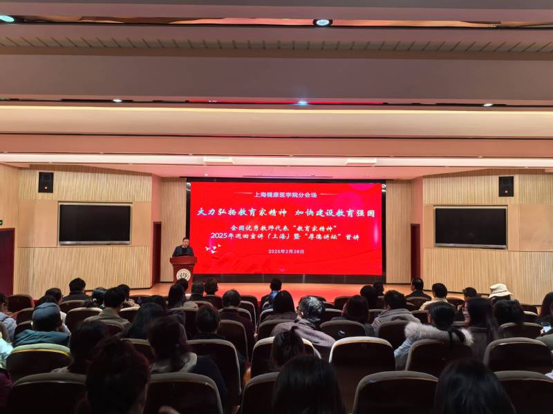 为深入学习贯彻习近平总书记关于教育的重要论述,特别是对教育家精神的深刻诠释,大力弘扬教育家精神,激励广大教师自觉践行教育家精神,2月28日,教育部通过线上线下结合的形式举行全国优秀教师代表“教育家精神”2025年巡回宣讲会(上海)。学校高度重视,将本次宣讲作为学校2025年“厚德讲坛”首讲,设置线上线下分会场,副校长汤磊,党委宣传部、教师工作部、人事处、机关党总支负责人,以及教师代表、辅导员代表和部分职能部门代表于北苑1号楼200人报告厅收看线下宣讲,其他教师通过线上直播实现全覆盖学习。党委宣传部、教师工作部部长李兆伟主持报告会学校分会场。