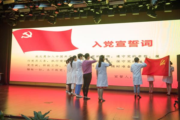 在同唱庄严的国歌后,由附属周浦医院党委组织委员顾蓁同志带领6名新党员面对鲜红的党旗,举行了庄严的入党宣誓。全体党员重温入党誓词,经历了一次精神上的洗礼。在援疆医疗工作期间光荣入党的外科医生马大喜代表新党员发言,他通过亲身经历讲述了自己的入党动机、援疆的工作经历及宣誓立志成为一名合格的共产党员。