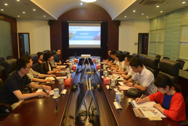 于莹对客人的来访表示欢迎,祝贺贵州大学医学院的成立,并向客人介绍我校办学定位、专业设置、育人成果和发展规划等相关情况。陈莉琼书记对我校的热情接待表示感谢,并对我校成立一年来取得的各项成就表示赞赏。双方就新学校筹建经验、办学体制机制创新、和医学人才培养模式创新等方面进行深入探讨。面对首个国家级大数据综合实验区落户贵州省带来的机遇,双方着重围绕大数据、大健康,在学科建设发展、优质资源共享、人才交流和联合培养等方面初步达成合作共识。