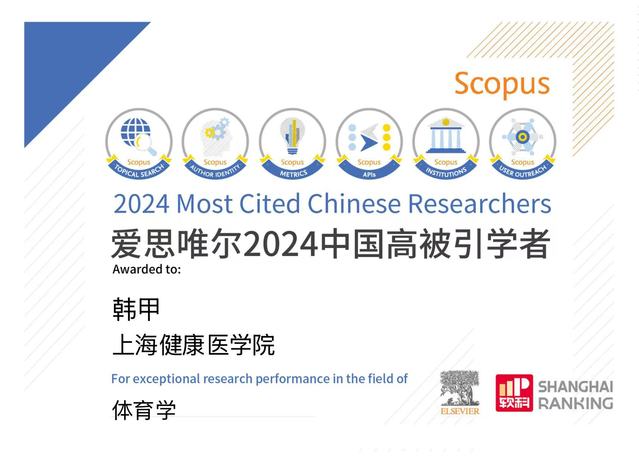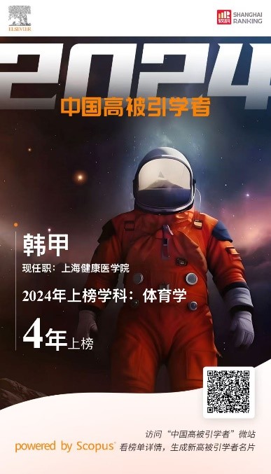近日,国际知名学术出版集团爱思唯尔(Elsevier)发布2024年度“中国高被引学者”(Highly Cited Chinese Researcher)榜单,我校康复学院韩甲教授再度入选,实现2021-2024年连续四年获此殊荣,彰显了其在运动康复领域的显著学术影响力。