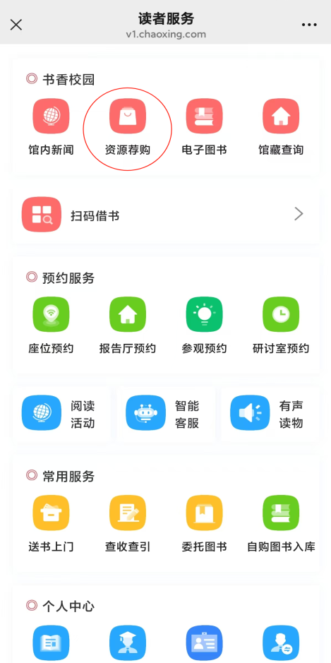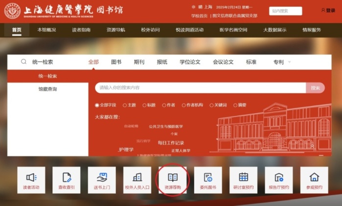 进入“资源荐购”页面: 在网站首页找到 “资源荐购”栏目,点击进入,如下图。